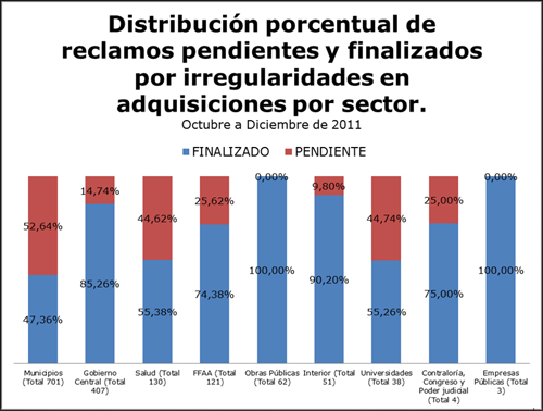 En cuanto a los reclamos pendientes -es decir que habiendo transcurrido el plazo de 2 días hábiles desde su recepción en cada organismo público no han sido respondidos por éstos- en el sector “salud”, los reclamos pendientes por irregularidades en adquisiciones aumentaron en 12,09 puntos porcentuales (44,62%) durante el trimestre octubre a diciembre de 2011 con respecto al trimestre anterior (32,53%). En el sector “municipios”, en tanto, los reclamos pendientes por irregularidades en adquisiciones durante el trimestre octubre a diciembre de 2011 (52,64%) aumentaron en 3,43 puntos porcentuales con respecto al trimestre anterior de 2011 (49,21%). En el sector “gobierno central”, se mantuvo la tendencia del trimestre anterior: 14,74% versus 15,09%.