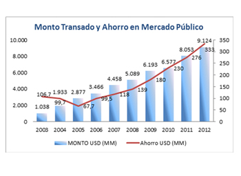 Las cifras de cierre de año arrojaron montos transados por los organismos del Estado a través de la plataforma de licitaciones de ChileCompra www.mercadopublico.cl que superaron los 9.100 millones de dólares. En términos de eficiencia, los ahorros alcanzaron los 333 millones de dólares. En cuanto al crecimiento en las ventas de las empresas regionales entre el año 2011 y el 2012, destacan los proveedores de la Región de Atacama con un aumento de 69% en el monto transado.