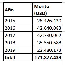 A continuación presentamos cuadro con montos transados por concepto de pasajes aéreos nacionales, desde 2015 a 2019 (2019 considera montos hasta el 30 de septiembre).