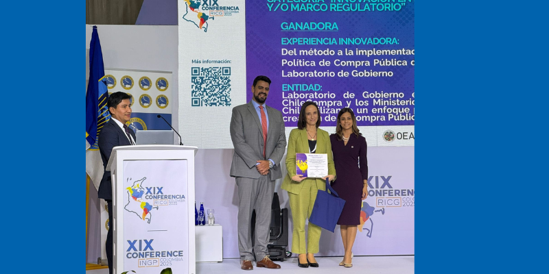 El Laboratorio de Gobierno ha sido galardonado con el Premio Red Interamericana de Compras Gubernamentales 2025 (RICG 2025), iniciativa conjunta implementada por ChileCompra y el Ministerio de Hacienda, en la categoría “Innovación en Reformas Institucionales y/o Marcos Regulatorios por la experiencia “Del método a la implementación: Co-creación de la primera Política de Compra Pública de Innovación (CPI) y el rol del Laboratorio de Gobierno”.