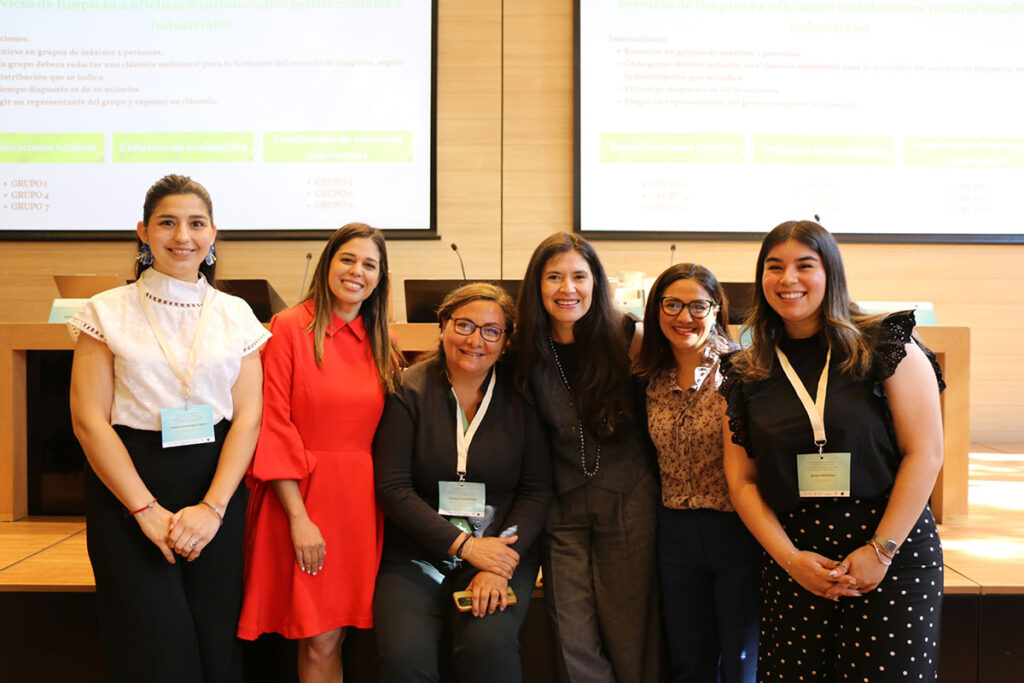 En una primera instancia se abordó la “ambientalización” de las licitaciones públicas, donde Ximena Lazo Vitoria, de la Universidad de Alcalá, y la fiscal de ChileCompra, Verónica Palma, entregaron recomendaciones para aplicar este enfoque en las distintas etapas de los procesos, ya sea en las especificaciones técnicas, los criterios de evaluación o la ejecución contractual. Posteriormente, las personas asistentes trabajaron en grupos para desarrollar ejemplos de incorporación de la ambientalización en una compra de servicios de limpieza, generándose una productiva sesión de ideas y retroalimentación.