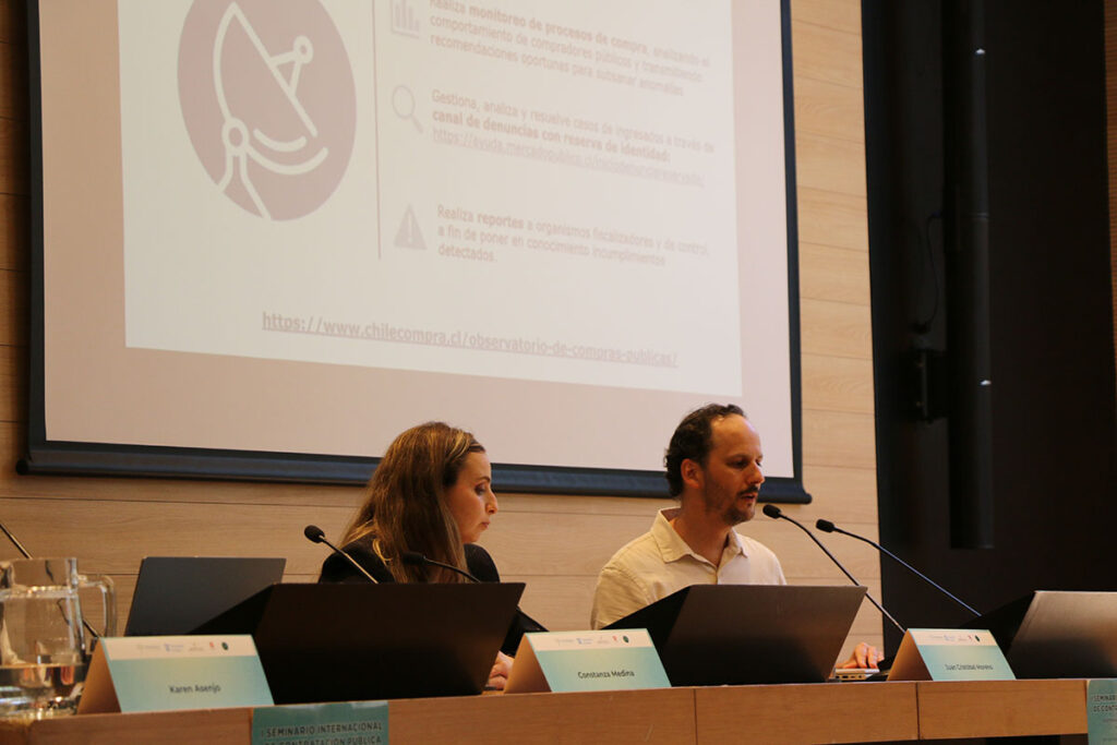 El seminario finalizó con el bloque “Contratación pública y desafíos tecnológicos: Ley de Transformación Digital e Inteligencia Artificial”, donde expusieron Constanza Medina, de la Contraloría General de la República y Juan Cristóbal Moreno, del Observatorio ChileCompra. En su presentación, este último se refirió a las irregularidades detectadas con mayor frecuencia en las compras públicas y a cómo las herramientas de ciencia de datos pueden contribuir a automatizar y facilitar su monitoreo.