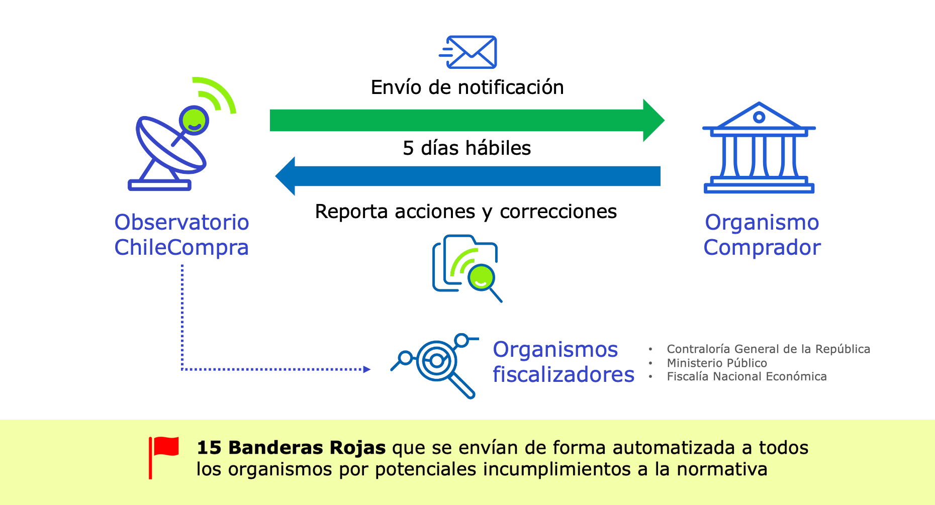 El nuevo sistema aplica 15 reglas de negocio, analizando la información estructurada contenida en las fichas de las licitaciones públicas, órdenes de compra y determinados documentos anexos. Así, la revisión detectará eventuales incumplimientos a la normativa, generando una notificación automática a los organismos públicos responsables, que llegará vía correo electrónico a los encargados de los procesos y a los usuarios con perfil ChileCompra, que se encuentren activos. Estos tendrán 5 días hábiles para corregir las situaciones y responder a ChileCompra, de lo contrario los casos podrán ser reportados ante los organismos fiscalizadores, es decir, la Contraloría General de la República, el Ministerio Público o la Fiscalía Nacional Económica según corresponda.
