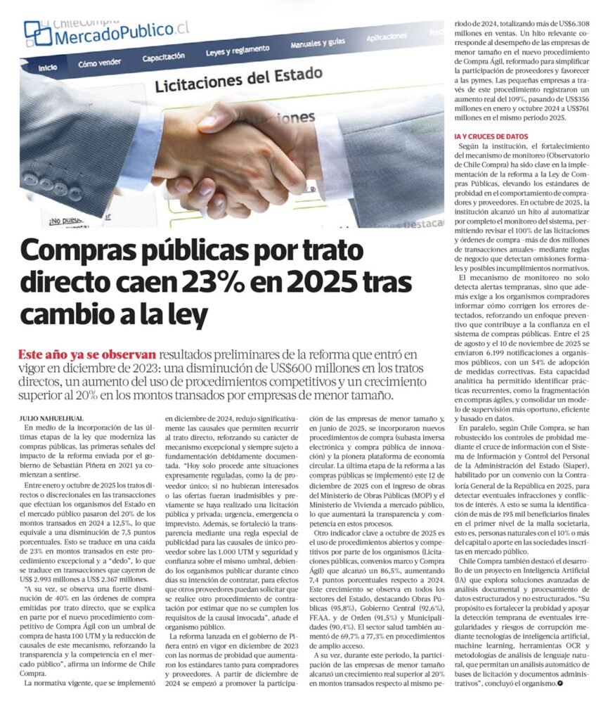 Asimismo, se refuerza la obligación de utilizar el Sistema de Información de Mercado Público, donde deben publicarse los antecedentes de la contratación directa, contratos y órdenes de compra, salvo las excepciones expresamente señaladas por la ley.