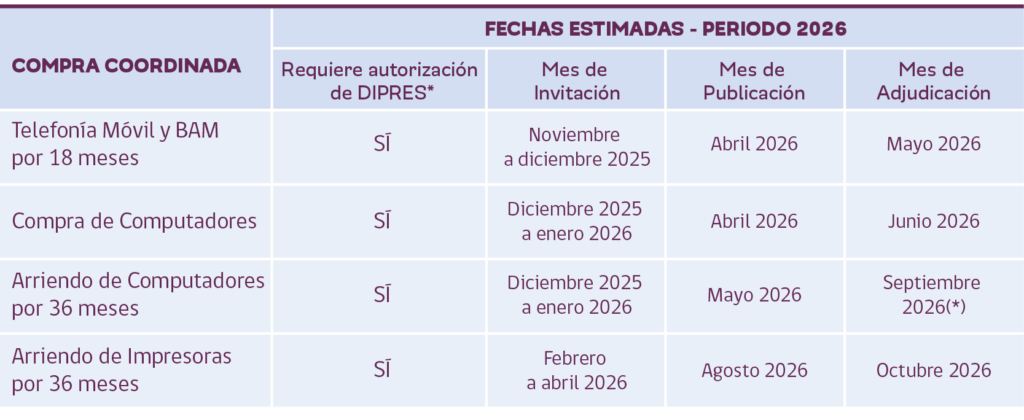 Con el objetivo de promover la agregación de demanda para obtener mejores precios, condiciones comerciales y reducir costos operacionales, durante el año 2026, la Dirección ChileCompra ha planificado efectuar Compras Coordinadas para las adquisiciones y contrataciones de los siguientes bienes y servicios: