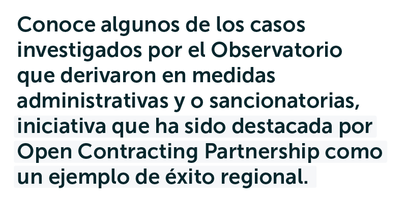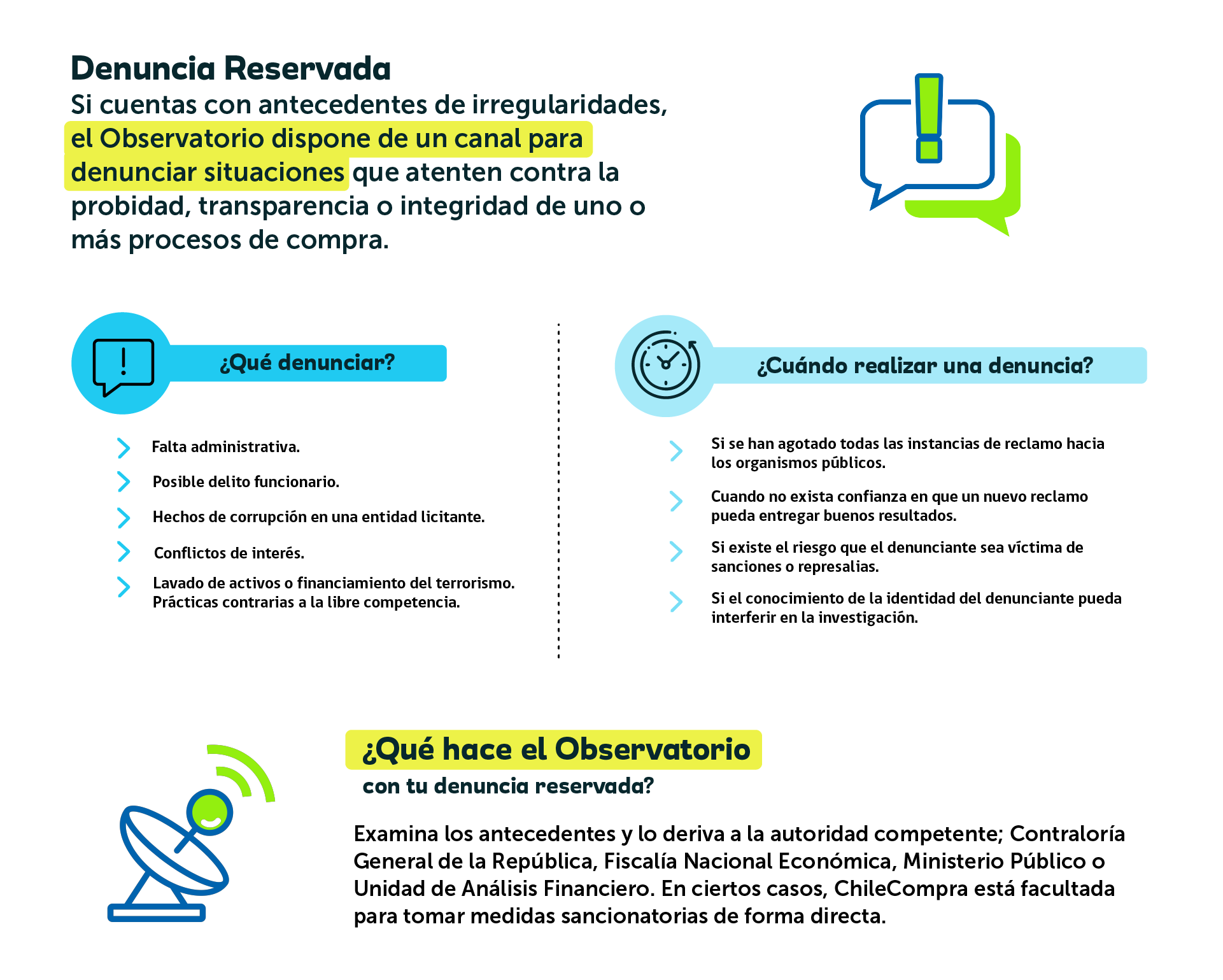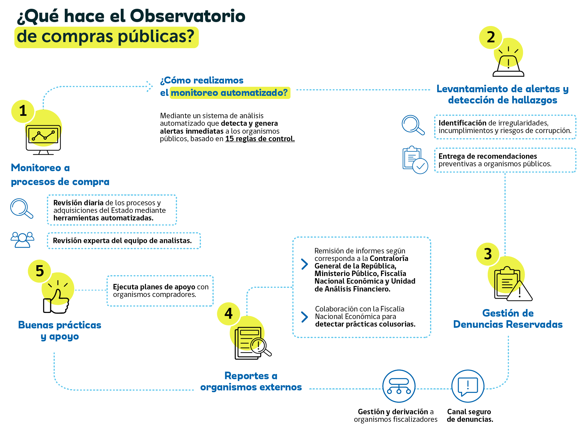 El Observatorio denuncia ante el Ministerio Público las irregularidades en compras públicas cuando estas revisten carácter de potencial de delito. Corresponde a la Fiscalía investigar los hechos y ejercer la persecución penal, a fin de que los tribunales de justicia determinen la responsabilidad de quienes resulten involucrados.